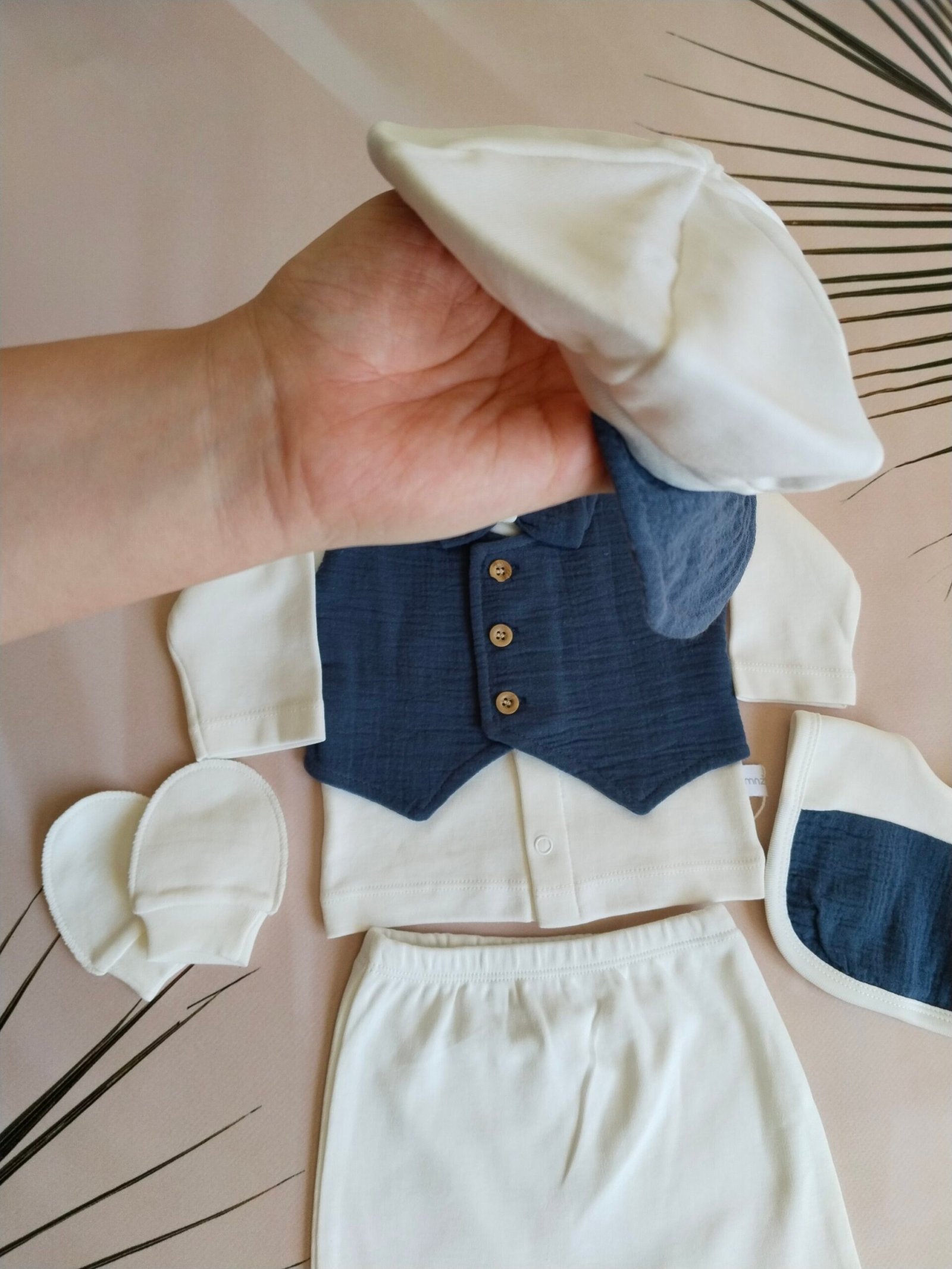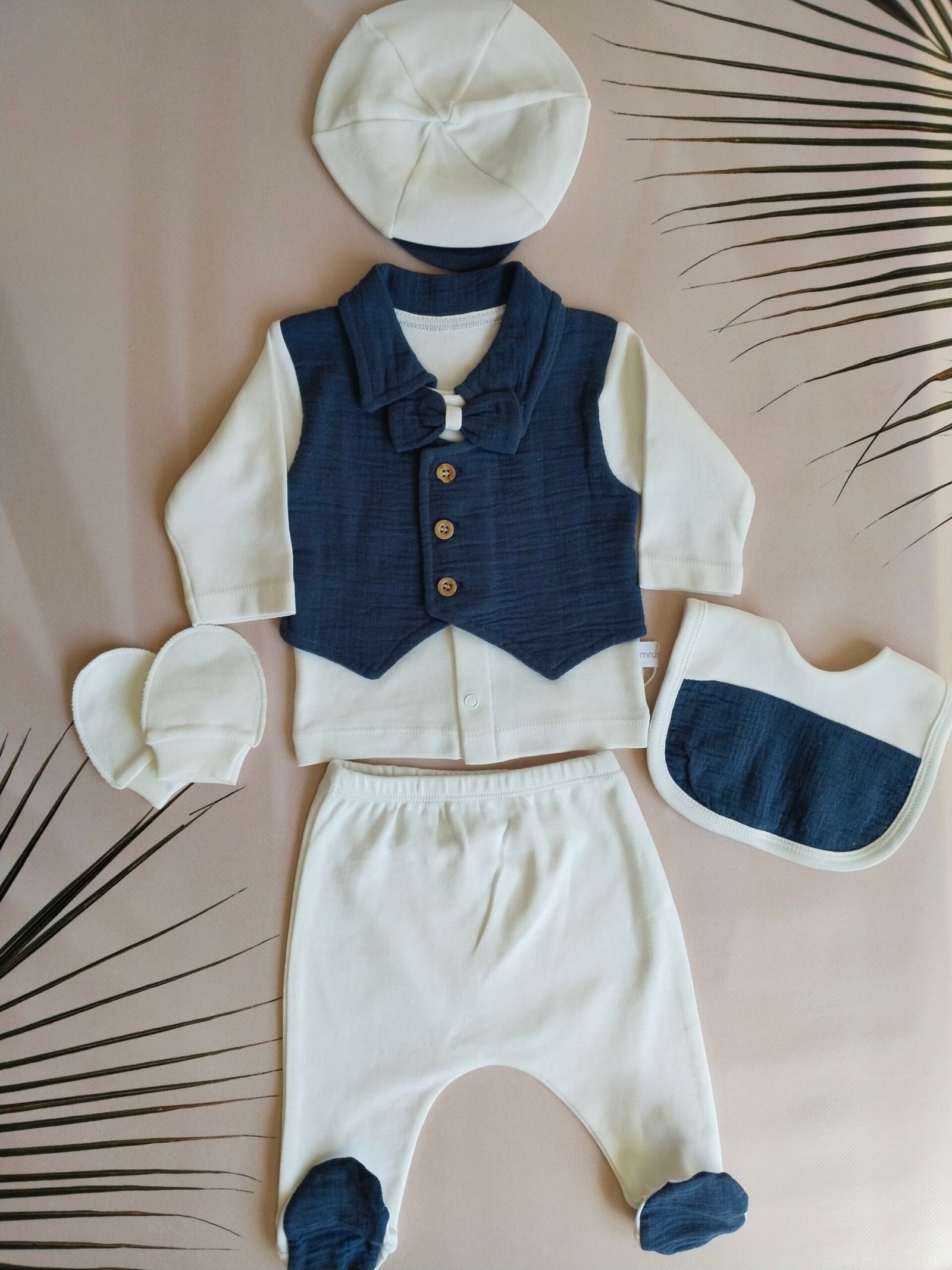 Lacivert Papyon Yelek Detaylı 5’li Yenidoğan Takımı – Navy Gent