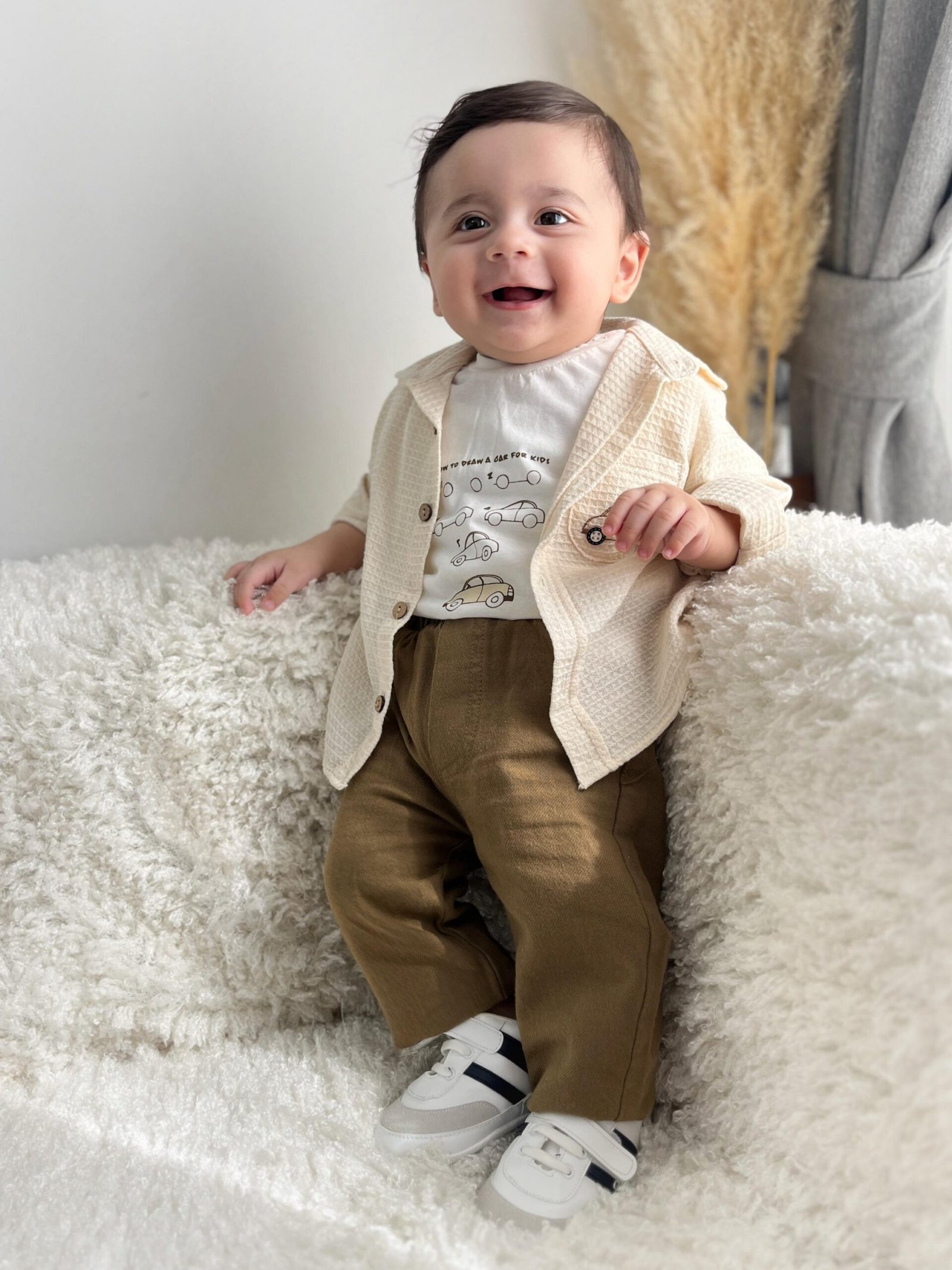 Minik şoförler için tasarlanmış şık ve rahat Little Driver üçlü erkek bebek takımı, bebeğinizin günlük kombinlerinde tarz yaratıyor! How to draw a car for kids yazılı, üzerinde araba nasıl çizilir gösteren eğlenceli tasarımıyla dikkat çeken beyaz uzun kollu çıtçıtlı üst, eğitici ve sevimli bir detay sunuyor. Üstün üzerine krem rengi, yumuşak dokulu gömlek eklenerek şıklık artırılıyor. Göğüs kısmındaki araba figürü ile tamamlanan gömlek, takımın eğlenceli havasını pekiştiriyor. Alt kısmında ise rahat hareket özgürlüğü sağlayan, kahverengi kot pantolon yer alıyor. Beli lastikli yapısı sayesinde konforlu bir kullanım sunuyor.