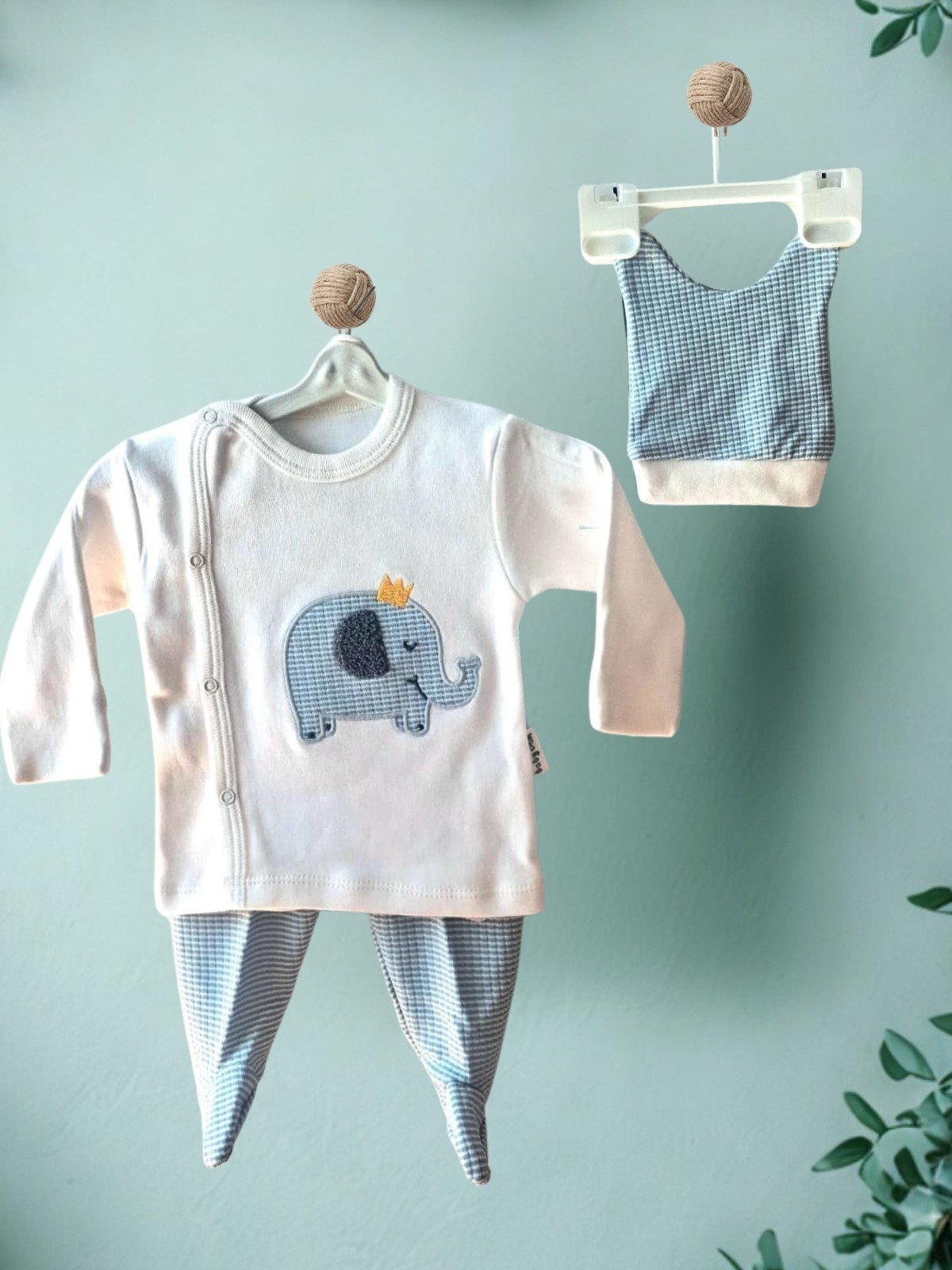 Taçlı Fil Detaylı 3’lü Yenidoğan Bebek Takımı – Sevimliliğin ve Konforun Buluştuğu Tasarım!